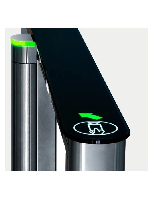 Pasillo automático de hojas batientes ST-01 está equipado con dos pictogramas LED que indican la dirección de paso y si está libre o bloqueado. Las tapas superiores están adaptadas interiormente para la colocación de lectores de proximidad. Para otros tipos de identificación, como huella o facial, se usan peanas adicionales.